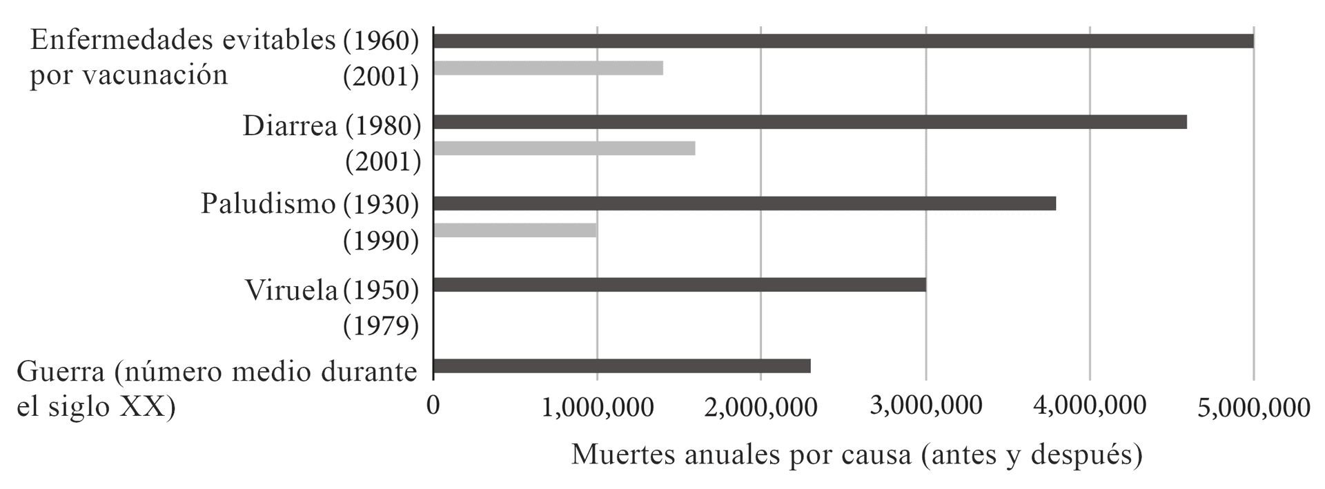 En todos los casos, nuestras intervenciones han evitado al menos 2,5 millones de muertes al año. Para ayudar al lector a comprender la magnitud de estos logros, he añadido una barra final que muestra el número medio de muertes anuales debidas a la guerra y el genocidio juntos a lo largo del siglo XX (2,3 millones). Así pues, en cada una de las cuatro áreas, nuestras intervenciones sanitarias salvan más vidas de las que se salvarían con una paz mundial duradera.